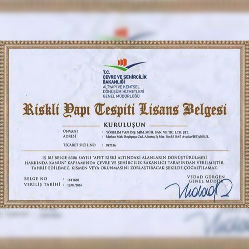 Firmamız, Çevre, Şehircilik ve İklim Değişikliği Bakanlığı tarafından yetkilendirilmiş Riskli Yapı Tespit Kuruluşu olarak, mevcut yapıların deprem ve taşıyıcı sistem güvenliğini bilimsel yöntemlerle değerlendirmektedir. Riskli yapı tespiti süreci, yürürlükteki mevzuat ve yönetmeliklere uygun şekilde, alanında uzman mühendis kadromuz tarafından titizlikle yürütülmektedir.